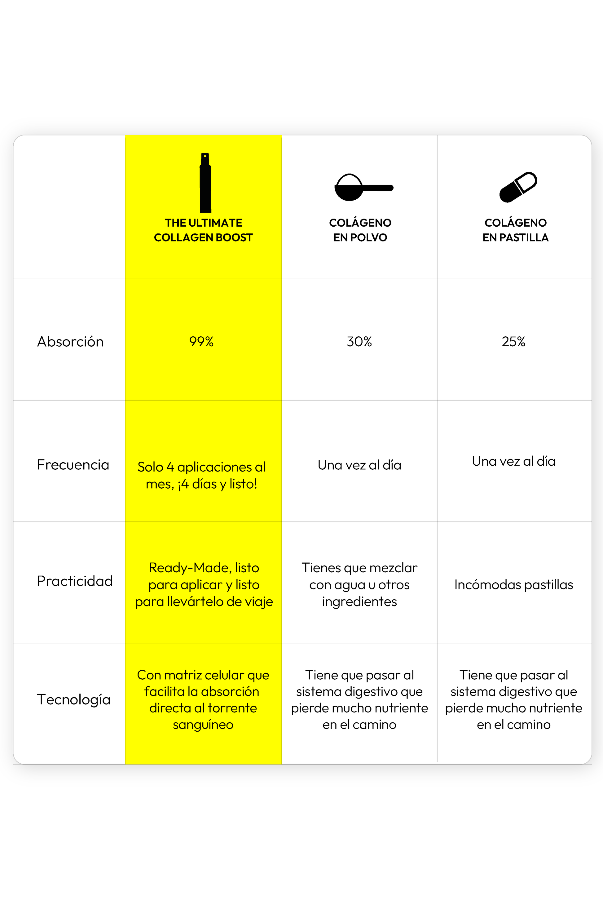 Resultados comprobados en 6 semanas. Olvídate de mezclar o tomar pastillas incómodas, un gotero contiene todo el mega impulso de colágeno que tu cuerpo necesita.